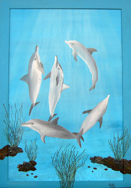 "Delfine im Reigen" Format 120 x 80 in Acryl/Ö- Kombination auf Leinwand von Astrid Krischun 2005
